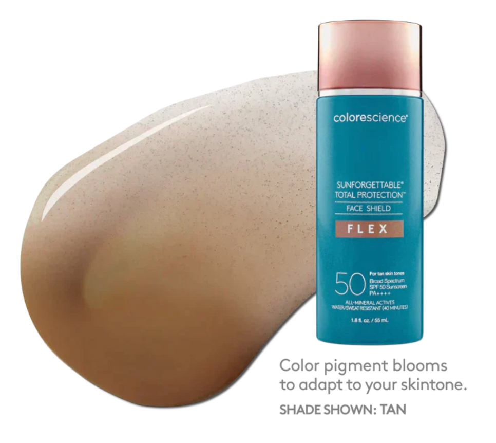 Sunforgettable Total Protection Face Shield Flex SPF 50 delivers powerful environmental protection and immediately evens skin tone for a healthy, natural appearance. Available in four uniquely flexible shades for a range of skin tones, it features innovative, tone-adapting pigments that offer medium, buildable color coverage with a natural finish. Imperfections are blurred and skin tone is even.